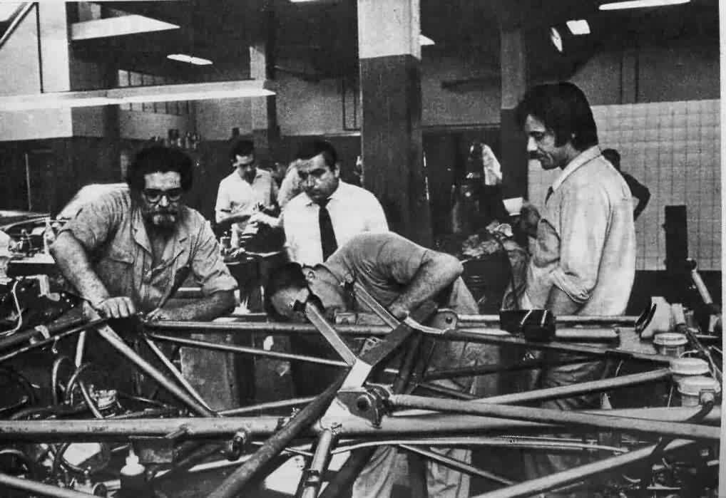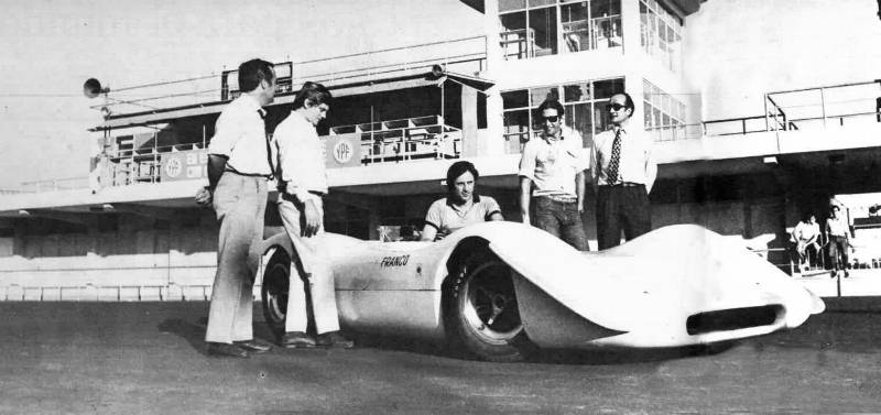 En la oportunidad, Franco condujo el auto por primera vez, luego de varios giros con el Brabham Cosworth F2, (en la foto puede vérselo, al fondo) que oficiaba de coche-escuela para que los pilotos se fueran identificando con la insólita relación peso-potencia del prototipo.