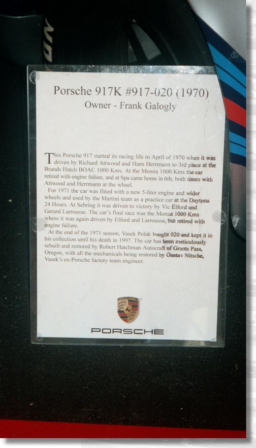 Había una gran carpa-museo con todos los autos que ganaron Sebring alguna vez (inclusive la Ferrari de Fangio), y adivina cual estaba en primerísimo lugar... Si señor !!! ...ha Ud. acertado. Un brillantisimo, hasta la exageracion, 917 del equipo Martini, que tenia pintado en sus laterales el número 3 y los nombres de sus pilotos: Elford- Larrousse.