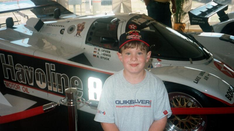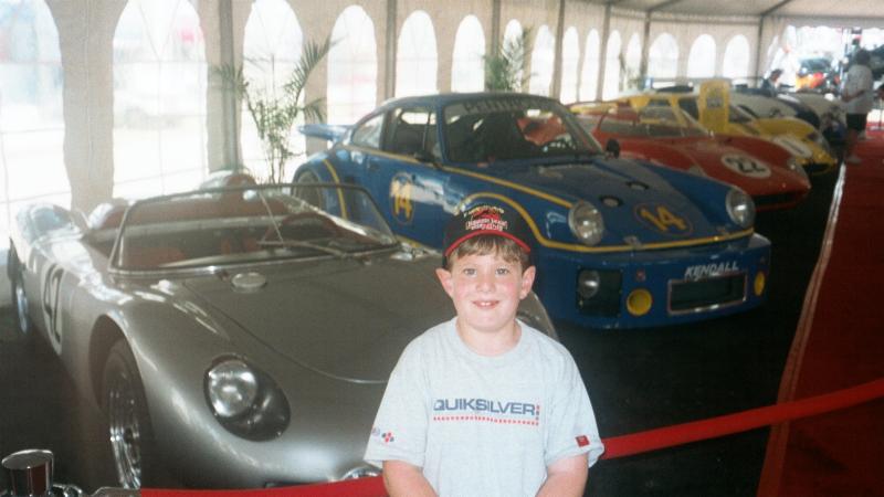 | Albertito posando delante de otros Porsche exhibidos en el Museo | |