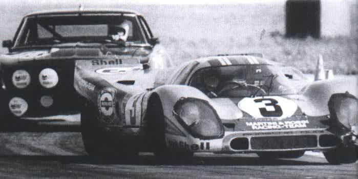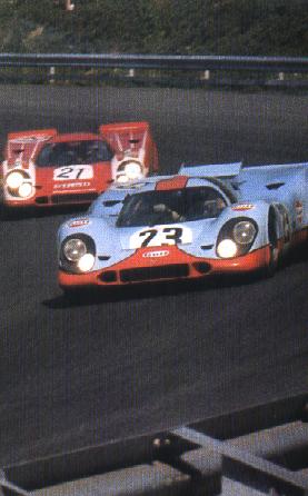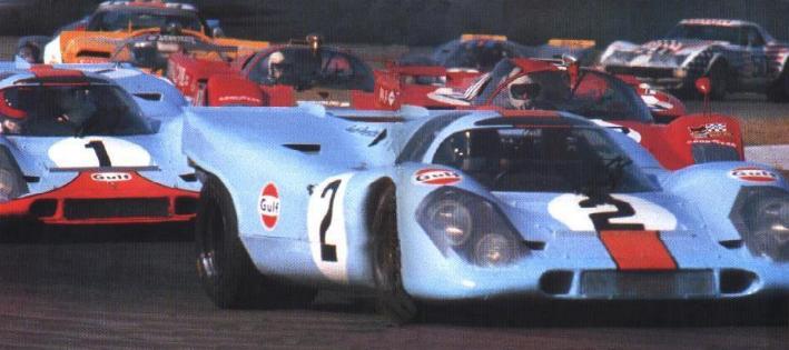 Tres semanas después, en Brands Hatch, Rodríguez/Kinnunen vencieron, Elford/Denny Hulme terminaron segundos y Herrmann/Attwood en 3º lugar. Rodríguez/Kinnunen vencieron también en los 1000 km. de Monza (casa de Ferrari) y en los 1000 km. de Spa-Francorchamps. DE NUEVO LE MANS La mira estaba puesta en Le Mans y todo indicaba que el arma estaba a punto. Para contraatacar a Ferrari que inscribió nada menos que 11 de sus 512S, Piech dispuso de tres 917K para John Wyer; un 917K y un 917LH para el Salzburg; y un 917LH para el Equipo Martini, conducido por el francés Gerard Larrousse y por el alemán Willy Kauhsen - este último pintado con motivos psicodélicos en verde y rojo, fué llamado "hippie" -. El Martini disponía también de un 908 en manos de Rudi Lins y Helmut Marko. Interesante fué la participación del 917K del Equipo AAW patrocinado por el actor Steve McQueen. Por intermedio de su productora, la Solar Productions, McQueen inscribió un 908 equipado con cámaras para filmar imágenes de la pista. Así como Forghieri, Piech tambien acreditaba una buena cantidad de máquinas. En los entrenamientos, Ferrari mostró a que venía. La 512S de Vaccarella giró en 3min20s0 pero Elford con esfuerzo logró hacer 3min19s8 con su 917LH. Después de Vaccarella venían los dos autos del John Wyer, una Ferrari, los autos del Salzburg, otra Ferrari y un auto del AAW. Matra y Alfa Romeo tambien lo intentaban, pero ésta vez la lucha era entre gigantes.